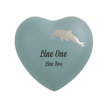 The Aero Dolphin Heart Keepsake Urn is a handcrafted heart-shaped urn made of durable brass with a soft matte teal finish. Its finely detailed nickel-plated dolphin motif symbolizes harmony, playfulness, and the freedom of spirit. With a 3 cubic inch capacity, this small keepsake urn is designed to hold a portion of ashes, making it ideal for families who wish to share their loved one’s memory. Measuring 2.7" H × 2.9" W × 1.6" D, it features a secure threaded back closure. A velvet presentation box is included, and optional personalization allows engraving for a unique and lasting tribute.
