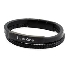The Black Triple Band Leather Metal Cremation Bracelet blends strength and style, offering a discreet way to keep a loved one close. Made with stainless steel and durable black leather, its three distinct bands—smooth, braided, and metal-accented—create a modern design. A hidden compartment holds a nominal amount of ashes, secured by a threaded closure. The bracelet measures 8.5" in circumference, and the metal plate may be personalized with pewter-colored engraving, making it a truly meaningful keepsake.