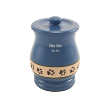 Blue Paw Print Band Medium Pet Cremation Urn is a ceramic urn with a glossy blue finish and a matte tan band with debossed paw prints, symbolizing friendship and lasting love. It holds 40 cubic inches and seals securely using gel glue. Each urn includes a protective bag, tie, and gel glue. Personalization is available with ivory engraving for a dignified tribute.
