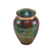 The Classic Raku Keepsake Urn is a handcrafted brass urn finished with a vibrant hand-applied raku glaze in tones of green, red, and purple. Each urn is one-of-a-kind, reflecting individuality and the beauty of life’s journey. With a capacity of 5 cubic inches, it holds a small portion of remains, perfect for sharing among family members. The threaded lid provides secure closure, and each urn includes a soft velvet bag for dignified safekeeping. Compact, colorful, and unique, it offers a personal way to honor cherished memories.