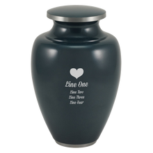 The Classic Vase Form Navy Extra Large Cremation Urn is made from durable brass, finished in a deep navy blue enamel accented by polished silver trim. This timeless vase-style urn provides a spacious 300 cubic inches of capacity, ideal for a larger adult or for combining remains. The secure threaded lid ensures safe closure, while the rich navy finish symbolizes honor, serenity, and eternal remembrance. Personalization with engraved text in pewter is available to create a meaningful tribute.