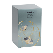 The Ginkgo Leaf Pewter Companion Urn – Left Side is a graceful memorial crafted from brushed stainless steel with a refined pewter finish. It features hand-painted ginkgo leaves in gold and blue tones, symbolizing resilience, harmony, and eternal life. This full-size adult cremation urn provides a 200 cubic inch capacity, secured with a bottom panel fastened by four screws. It can be displayed individually or paired with the Ginkgo Leaf Pewter Companion Urn - Right Side to form a complete companion urn set. Each urn includes a protective bag with tie closure, ensuring dignity and safekeeping.