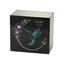 Hummingbird Teal Black Marble Adult Cremation Urn is crafted from genuine black marble with natural veining. A teal hummingbird and floral vine with shell inlays symbolize beauty and enduring love. It provides 200 cubic inches of capacity in 8" H x 5" D x 8.5" W dimensions and secures with a threaded bottom closure. A protective bag with tie is included. Personalization is available for names, dates, or a short message.