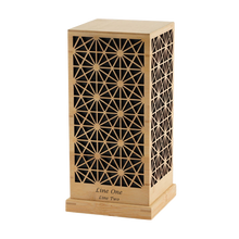 The Intricate Bamboo Design Extra Large Cremation Urn is carefully crafted from bamboo, a material known for its natural beauty, strength, and sustainability. Featuring an elegant geometric lattice pattern, this urn blends artistry with function, serving as both a memorial vessel and a decorative display piece. With a 250 cubic inch capacity, it is suitable for most adults. The sliding bottom panel secured by a screw ensures ashes are safely contained, while a protective bag and tie are included. Families may also add personalization in dark brown engraving, making each urn a one-of-a-kind tribute.
