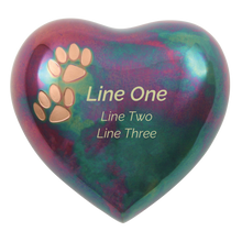 The Raku Brass Heart Small Pet Urn with Double Paw Print is a beautifully crafted keepsake designed to honor the memory of a beloved pet. Made from durable brass with a stunning raku finish, this heart-shaped urn features two delicate bronze paw prints, symbolizing the lasting bond you shared. With a 20 cubic inch capacity. The urn is securely sealed with a threaded back closure and comes with a soft protective bag with tie. Personalization with custom engraving is available, making this urn a truly meaningful and unique memorial piece.