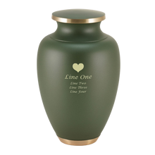 The Aero Tree of Life Extra Large Cremation Urn is a handcrafted brass cremation urn finished in a soothing matte green coating with a detailed hand-engraved Tree of Life motif. With an extra large 320 cubic inch capacity, it provides ample space for preserving the ashes of an adult loved one. Measuring 12.1" H × 7.5" W × 7.5" D, it is designed for families who prefer additional room or wish to include mementos. A secure threaded lid ensures ashes remain safely contained, and a protective bag is included. Optional personalization allows names, dates, or artwork to be engraved in a brass tone, creating a unique and lasting tribute.