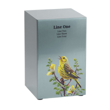 The Birds Pewter Companion Urn – Right Side is a meaningful memorial crafted from brushed stainless steel with a refined pewter finish. This urn features a vibrant yellow songbird design, symbolizing peace, renewal, and eternal love. This full-size adult cremation urn provides a 200 cubic inch capacity, with a secure bottom panel fastened by four screws. It can be displayed alone or paired with the Birds Pewter Companion Urn - Left Side to form a complete companion urn set. Each urn includes a protective bag with tie closure, ensuring dignity and safekeeping.