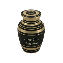 The Brass Onyx Engraving Band Black Keepsake Urn is a beautifully crafted brass urn finished in a deep onyx black tone accented with polished engraving bands in brass. With a capacity of 5 cubic inches, this keepsake urn is designed to hold a small portion of remains, providing a meaningful way to share and preserve memories among family members. A threaded lid ensures a secure closure, and a protective velvet bag is included for safekeeping. Compact and elegant, it offers a timeless tribute for display or remembrance.
