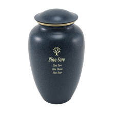 The Classic Granite Blue Gold Accent Ring Adult Cremation Urn is a full-size brass urn featuring a speckled blue and gray granite-style finish with a bronze accent ring beneath the lid. Its timeless appearance makes it a fitting memorial to display at home, in a columbarium, or at services. With a capacity of 195 cubic inches, this urn securely holds the ashes of an adult. Ashes are kept safe in a bag with tie inside an easy-close threaded lid, combining strength with dignified beauty.