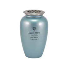 The Classic Lotus Lid Blue Frost Scattering Adult Cremation Urn is a serene and symbolic choice for memorial ceremonies. Crafted from durable brass with a frosted blue finish, this urn is topped with a brushed pewter lid engraved with a lotus flower, symbolizing purity, enlightenment, and rebirth. With a capacity of 200 cubic inches, it holds the ashes of an adult weighing up to 200 lbs. Designed for scattering ceremonies, its push-in lid ensures a secure closure while maintaining dignity and ease of use.