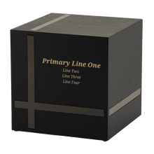 The Ebony and Gray Contemporary Extra Large Cremation Urn offers a modern tribute with clean lines and minimalist styling. Crafted from durable medium-density fiberboard (MDF), it features a sleek ebony body accented by subtle gray inlays for a refined, contemporary look. With a 245 cubic inch capacity, it accommodates the ashes of an adult weighing up to 245 pounds. A sliding bottom panel with screw ensures secure closure, and a protective bag with tie is included. Optional engraving reveals a light-to-dark brown tone, creating a personalized and lasting memorial.