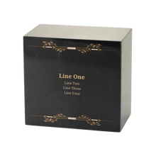 Gold Scroll Black Marble Adult Cremation Urn is crafted from genuine black marble with natural veining and an elegant gold scroll border accented with shell inlays. Symbolizing grace and remembrance, it offers 200 cubic inches of capacity in 8" H x 8.5" W x 5" D dimensions. A threaded bottom closure secures the contents, and a protective bag with tie is included. Personalization with gold engraving is available.