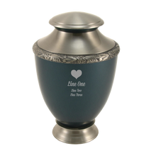 The Heirloom Indigo Adult Cremation Urn is made from solid brass, finished in a deep indigo blue enamel accented by an intricate floral band in pewter. This elegant adult urn holds up to 200 cubic inches of ashes, offering a secure resting place for a loved one. A threaded lid ensures safe closure, while the urn’s graceful silhouette and detailed craftsmanship make it a meaningful centerpiece for any memorial display. Personalization with engraved names or dates is available.