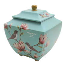 The Magnolia Lovebirds Blue Resin Adult Cremation Urn is a graceful and artistic memorial, crafted from durable resin and hand-painted in soft blue tones. Featuring magnolia blossoms and pair of lovebirds, this urn symbolizes love, peace, and eternal companionship. With a capacity of 200 cubic inches, it securely holds the ashes of an adult up to 200 lbs. A lift-off lid with secure fit ensures lasting protection while enhancing the urn’s elegant silhouette. Optional personalization allows families to engrave names, dates, or a message of remembrance.