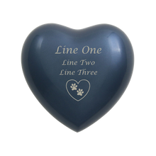 The Moonlight Blue Brass Heart Keepsake with Glossy Finish is a beautiful handcrafted memorial symbolizing peace and eternal love. Made from solid brass with a high-gloss moonlight blue finish, this elegant keepsake is designed to hold a small portion of ashes as a lasting tribute. The heart shape represents devotion and remembrance, while the threaded back closure ensures security. Personalization is available with pewter engraving, allowing you to add a name, date, or short message for a meaningful touch. Each urn includes a velvet presentation box for safekeeping and display.